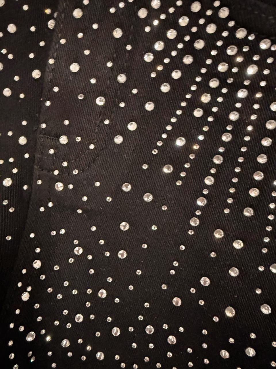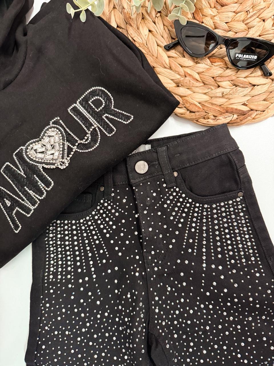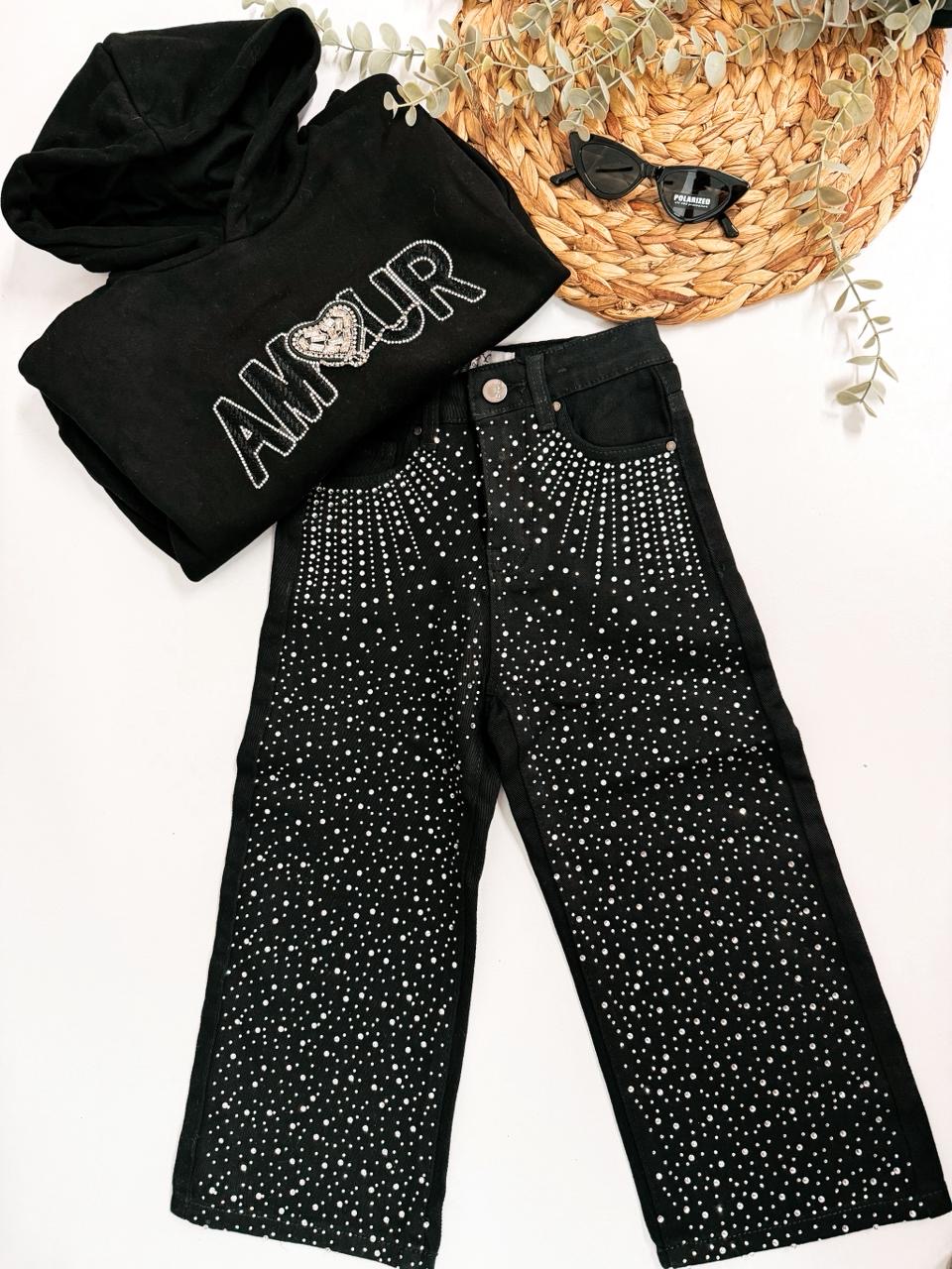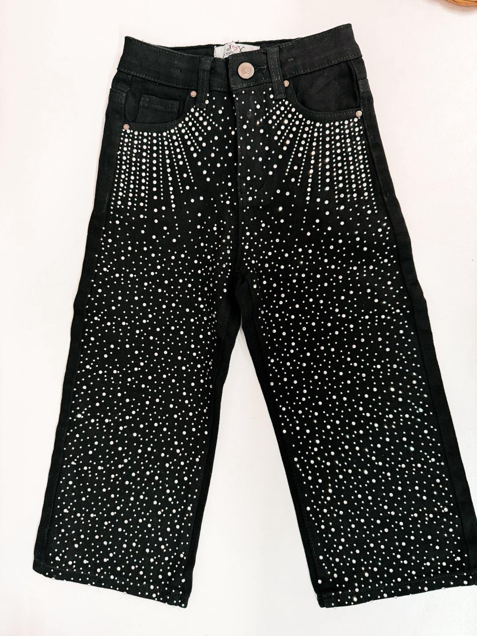Λάμψε με στυλ! Το μαύρο παιδικό τζιν με εντυπωσιακά στρας είναι η ιδανική επιλογή για μικρές fashionistas που αγαπούν τη μόδα και τη λάμψη! Κατασκευασμένο από ελαστικό ύφασμα για άνεση και ελευθερία κινήσεων, αυτό το τζιν συνδυάζει μοντέρνο design με παιχνιδιάρες λεπτομέρειες που τραβούν τα βλέμματα.