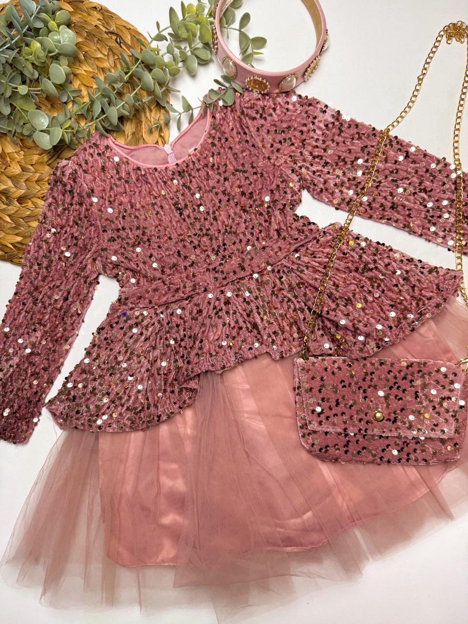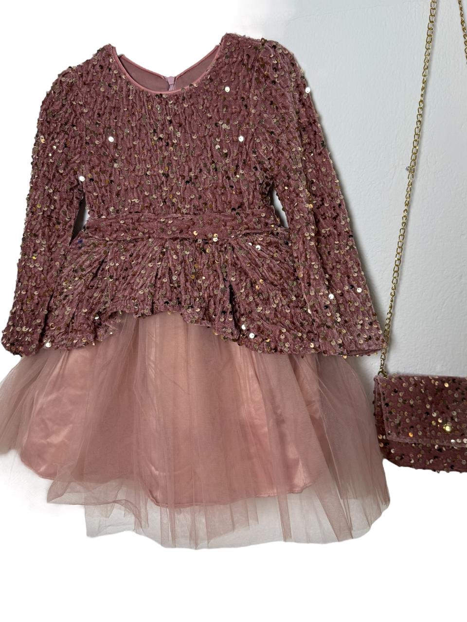 Παιδικό Φόρεμα Velvet Glam με Παγιέτα, Τούλι & Τσαντάκι – Μακρύ Μανίκι ροζ