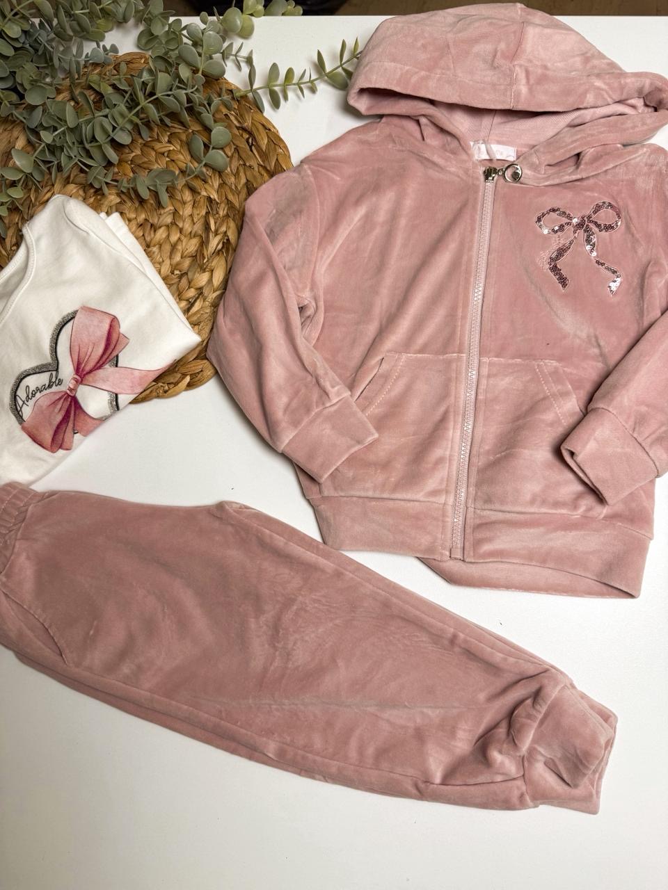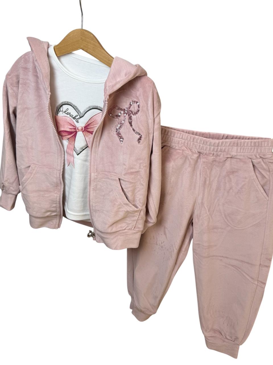 Ένα υπέροχο σετ τριών τεμαχίων για κορίτσια που συνδυάζει άνεση και κοριτσίστικη γλυκύτητα! Αποτελείται από μαλακή βελούδινη ζακέτα με φερμουάρ και διακοσμητικό φιόγκο από παγιέτες, παντελόνι φόρμας στο ίδιο χρώμα και υλικό, καθώς και λευκή μπλούζα με εντυπωσιακό τύπωμα “Adorable” και φιόγκο. Ιδανικό για καθημερινές εμφανίσεις με στυλ!