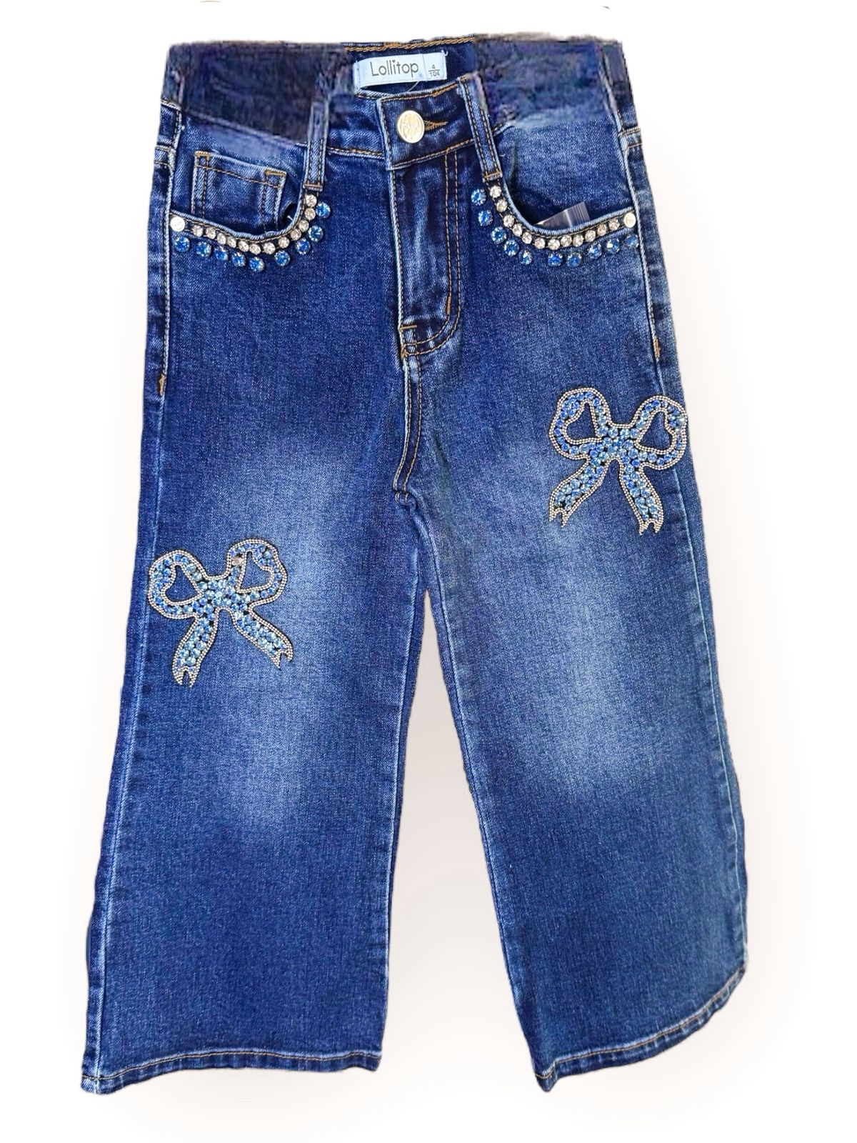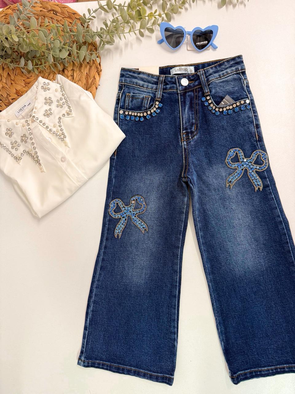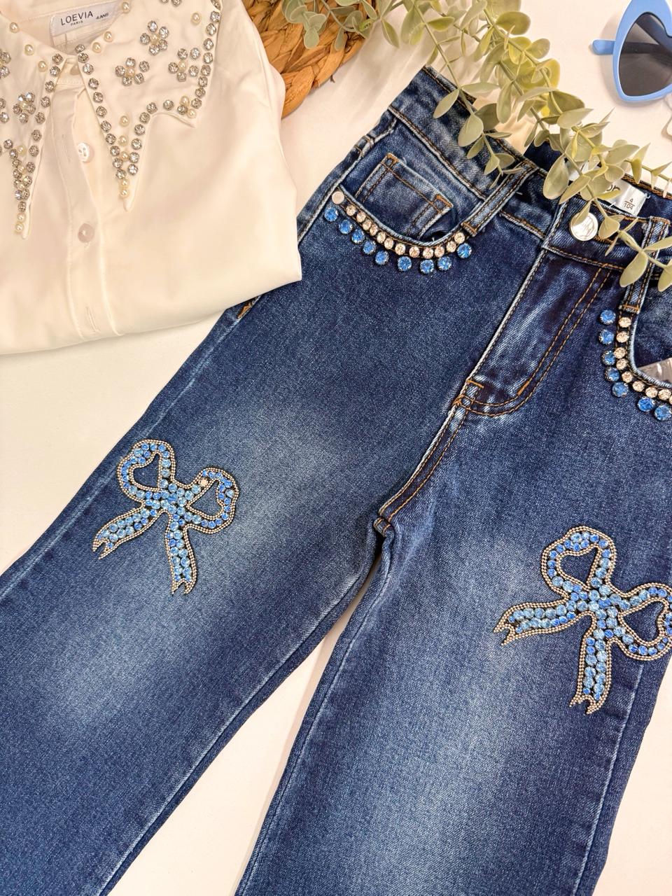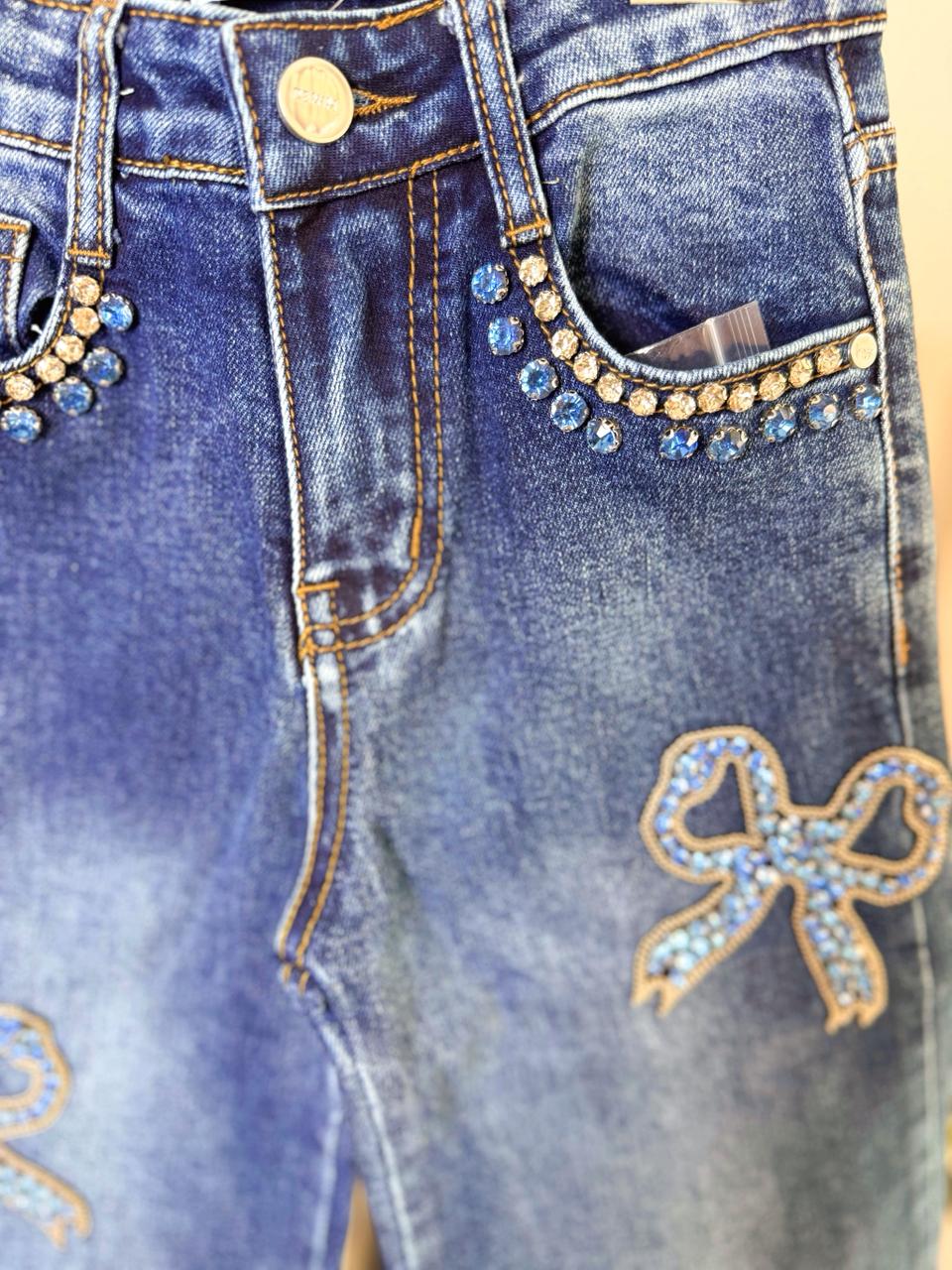 Ανανεώστε τη γκαρνταρόμπα της μικρής σας με αυτό το εντυπωσιακό παιδικό τζιν παντελόνι! Σε κλασικό μπλε χρώμα, διακοσμημένο με λαμπερές γαλάζιες πέτρες στις τσέπες και δύο φιόγκους με στρας στα μπατζάκια, προσφέρει μοναδικό στυλ και λάμψη σε κάθε εμφάνιση.