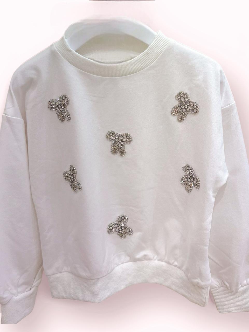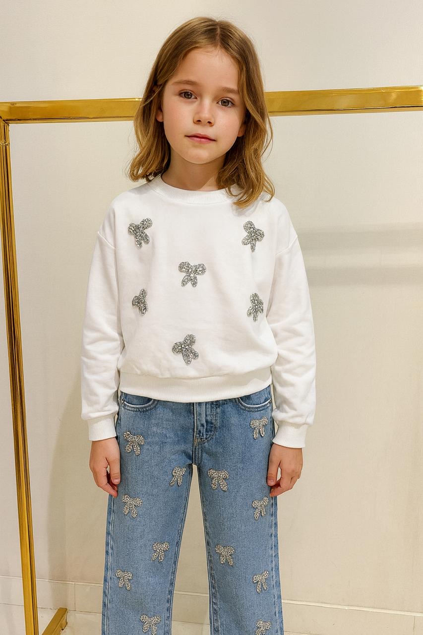 Ξεχωρίστε με αυτό το παιχνιδιάρικο παιδικό σετ που συνδυάζει άνεση και στιλ. Το λευκό sweatshirt είναι διακοσμημένο με εντυπωσιακούς strass φιόγκους στο μπροστινό μέρος, χαρίζοντας μια λαμπερή και χαρούμενη εμφάνιση. Ιδανικό για καθημερινές εξόδους αλλά και πιο ιδιαίτερες περιστάσεις.