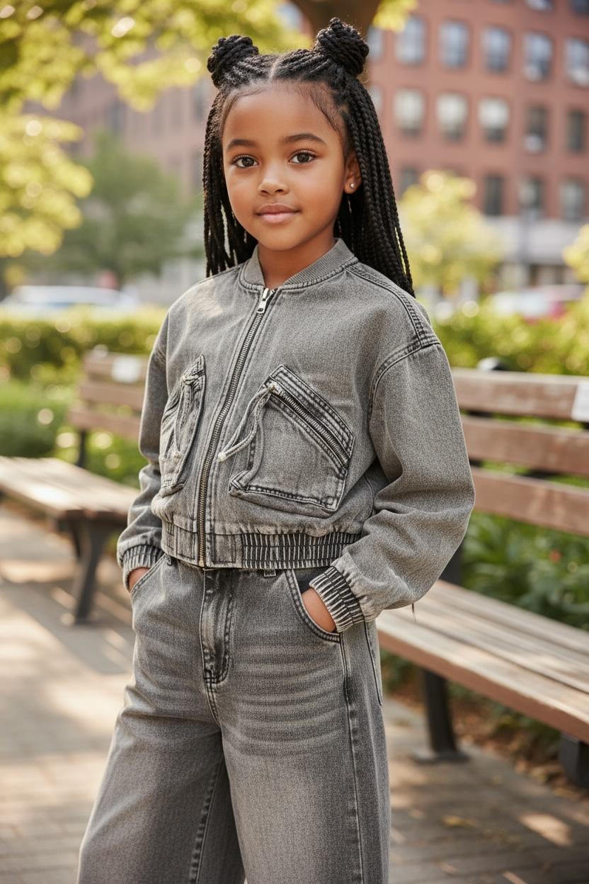 Στυλάτο γκρι σετ που αποτελείται από δύο κομμάτια. Το πάνω μέρος είναι τζιν μπουφάν με στρογγυλή λαιμόκοψη, λοξές τσέπες με φερμουάρ και ανοίγει με φερμουάρ. Από κάτω συνοδεύεται από τζιν παντελόνι σε άνετη γραμμή ρυθμιζόμενο λάστιχο εσωτερικά.