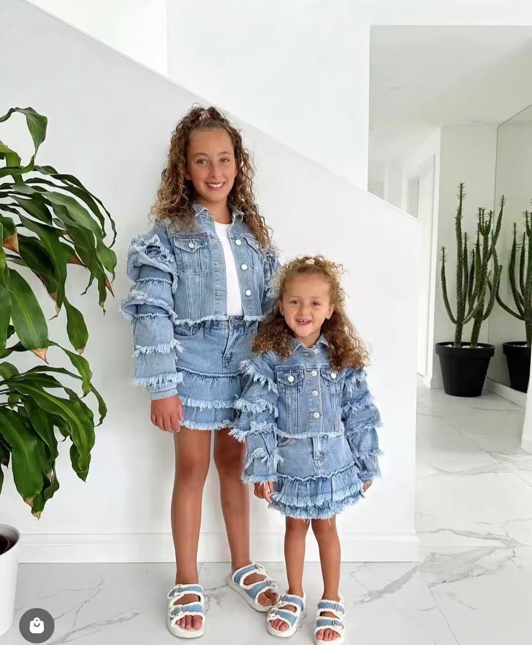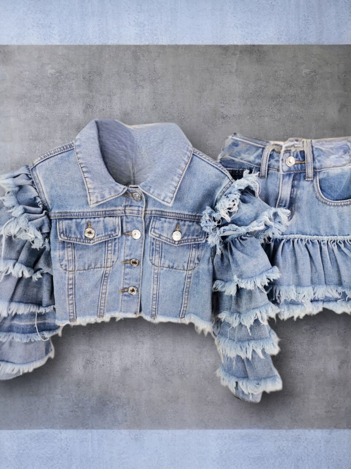 Αναβαθμίστε το παιδικό στυλ με αυτό το μοναδικό denim σετ, που περιλαμβάνει cropped τζιν τζάκετ και ασορτί φούστα με βολάν. Το τζάκετ ξεχωρίζει με τα ιδιαίτερα μανίκια διακοσμημένα με σειρές από ξέφτια, ενώ η φούστα ολοκληρώνει το look με παιχνιδιάρικα βολάν στο τελείωμα. Κατασκευασμένο από ποιοτικό denim, προσφέρει αντοχή και άνεση, ιδανικό για ιδιαίτερες εμφανίσεις με fashion-forward χαρακτήρα.