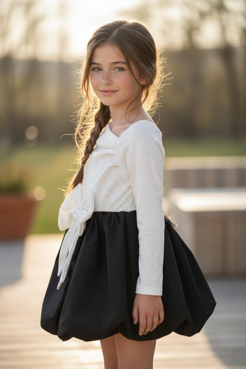 Κομψό παιδικό φόρεμα με συνδυασμό υφασμάτων. Το πάνω μέρος είναι βελούδινο με ιδιαίτερο κόψιμο στον ώμο και τρουξ στρασακια σε όλη την επιφάνεια. Στη συνέχεια συνεχίζει σε balloon φούστα με άλλο ύφασμα σε μαύρη απόχρωση.