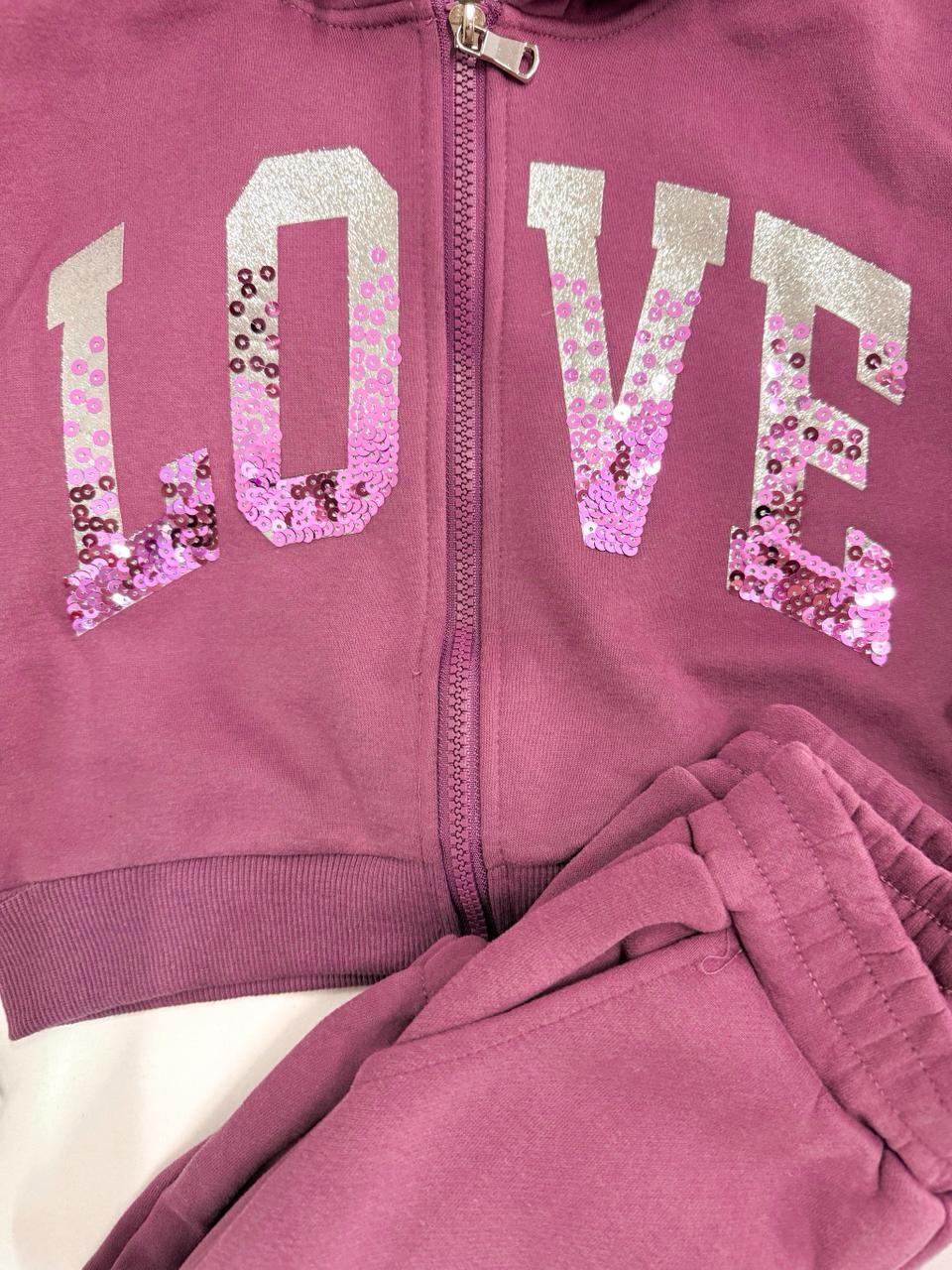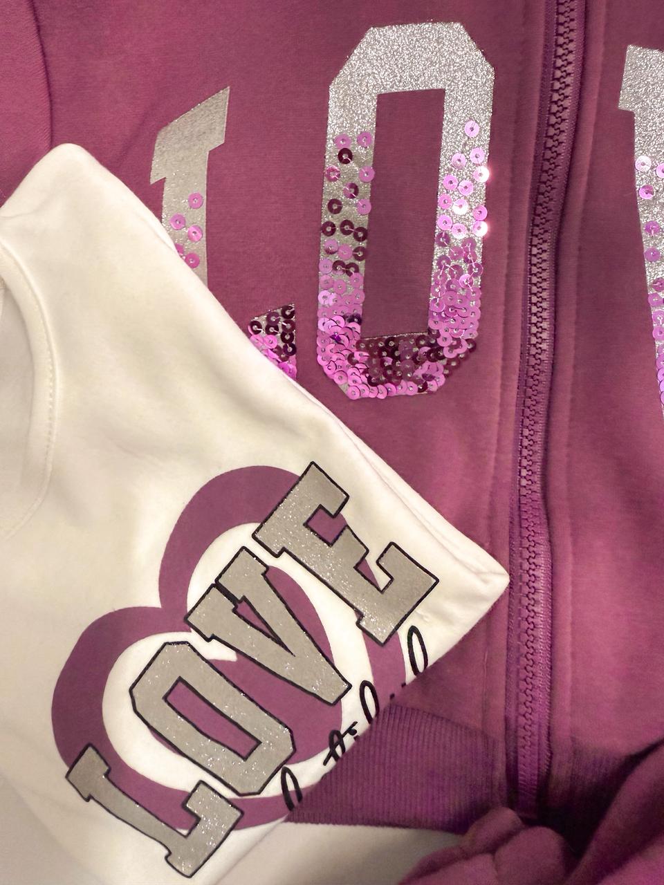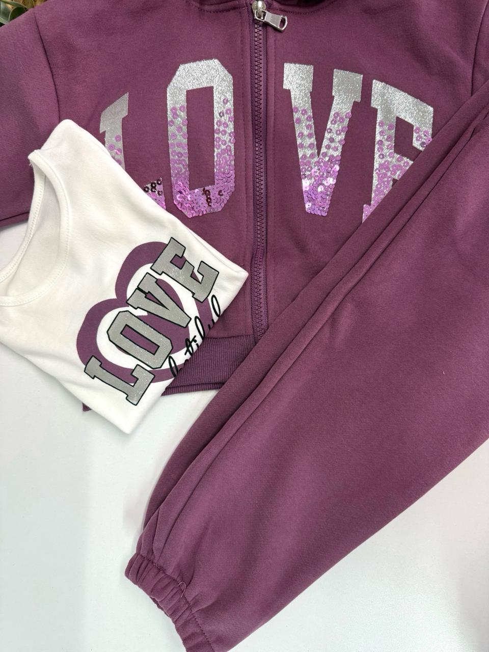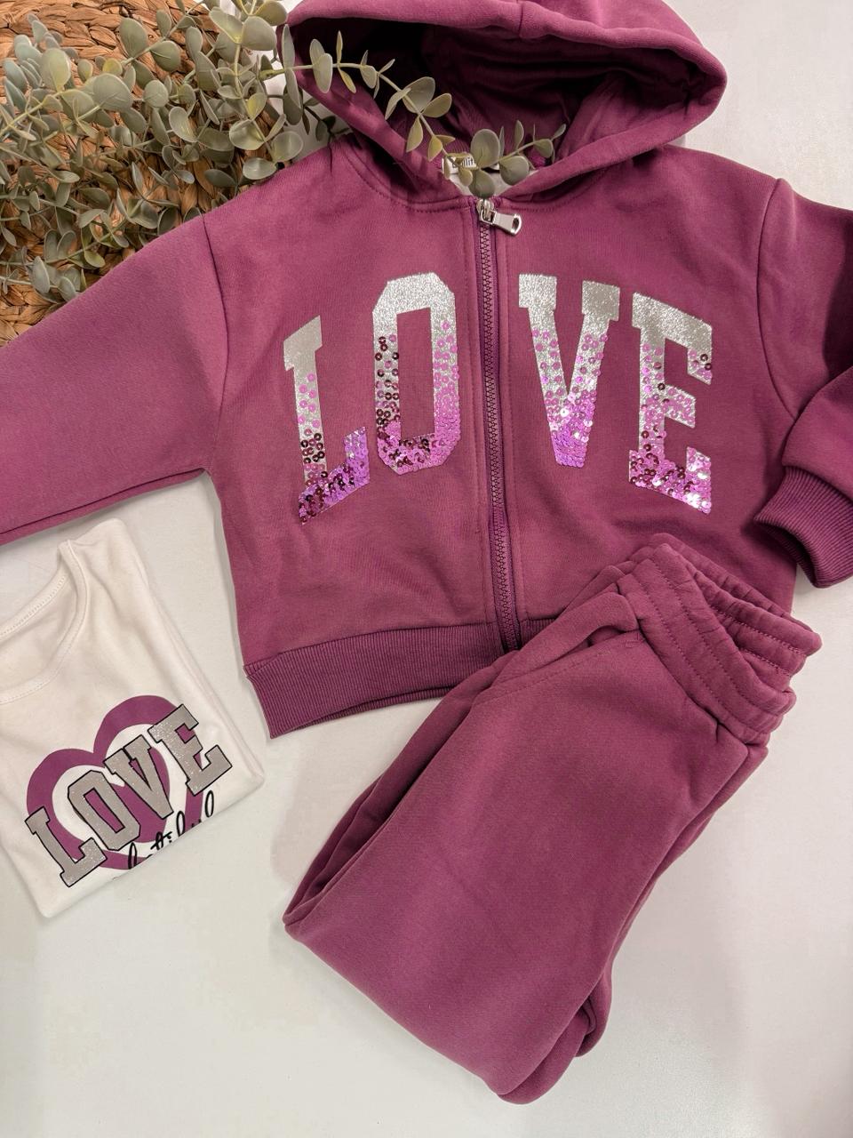 Το παιδικό σετ φόρμας Love συνδυάζει άνεση και στυλ σε ένα πρακτικό outfit για όλες τις ώρες. Αποτελείται από 3 τεμάχια: ζακέτα με κουκούλα σε μοβ απόχρωση με εντυπωσιακή στάμπα LOVE με παγιέτες, λευκό μακρυμάνικο μπλουζάκι και άνετο παντελόνι φόρμας. Ιδανικό για το σχολείο, τις βόλτες ή τις καθημερινές δραστηριότητες.
