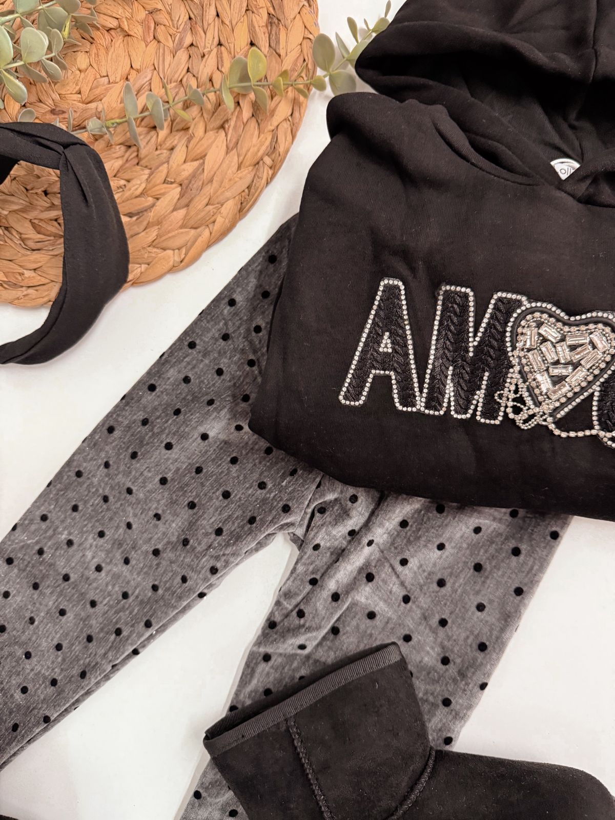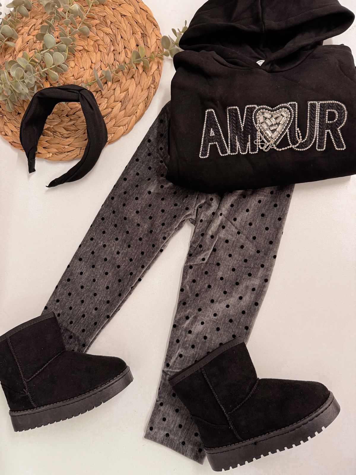 Σε απαλό γκρι χρώμα, με μαύρο πουά και διακριτικό γκλίτερ, συνδυάζει άνεση με παιχνιδιάρικη εμφάνιση. Το ελαστικό του ύφασμα προσφέρει ευκολία στην κίνηση, ενώ η απαλή υφή βελούδου χαρίζει ζεστασιά και κομψότητα.