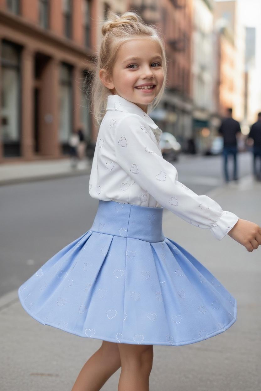 Υπέροχο σετ 2 τεμαχίων. Το σετ αποτελείται από λευκό πουκάμισο με καρδιές από στρας και γαλάζια φούστα με ίδιες καρδούλες από στρας.