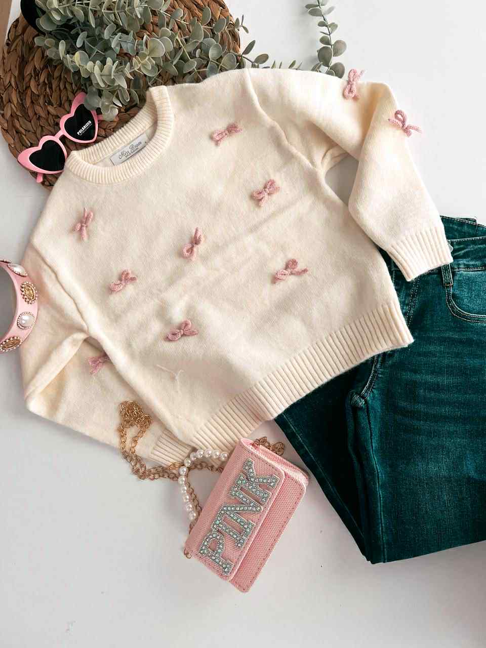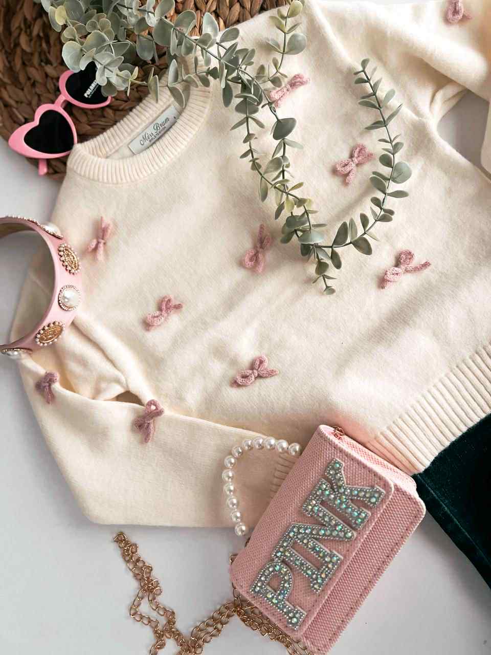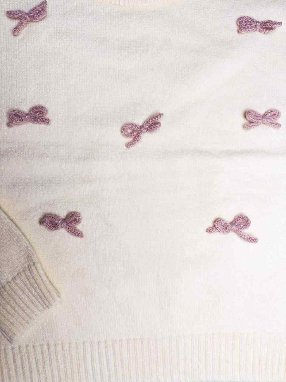Απαλή και ζεστή, αυτή η λευκή μπλούζα μάλλινη είναι η ιδανική επιλογή για τις πιο γλυκές εμφανίσεις. Διακοσμημένη με χαριτωμένα ροζ φιογκάκια, που προσθέτουν μια παιχνιδιάρικη και ρομαντική νότα. Ιδανική για να κρατήσει το παιδάκι ζεστό και στιλάτο σε κάθε περίσταση, από το σχολείο μέχρι τις βόλτες.