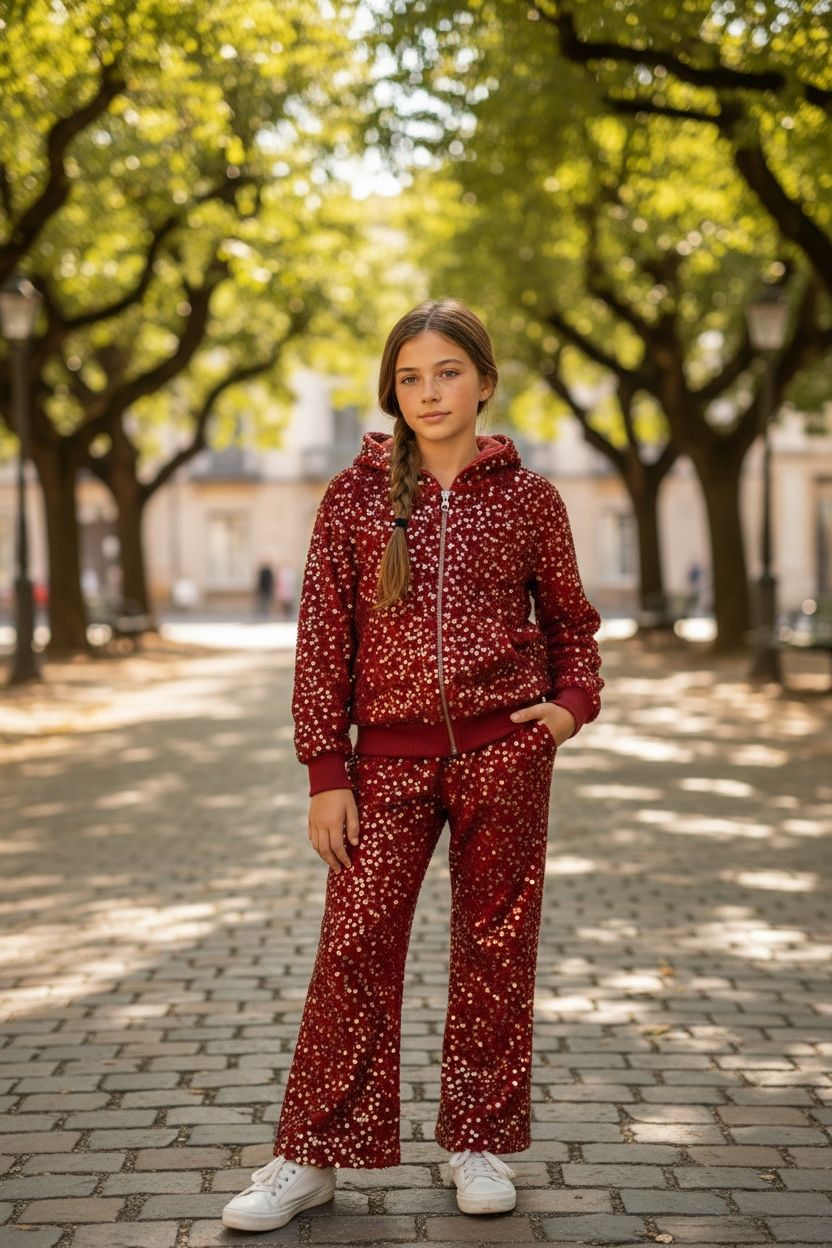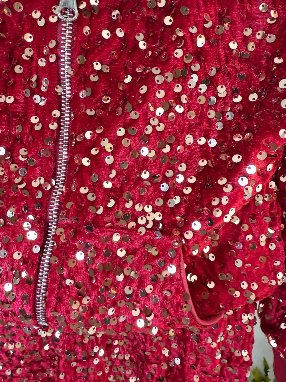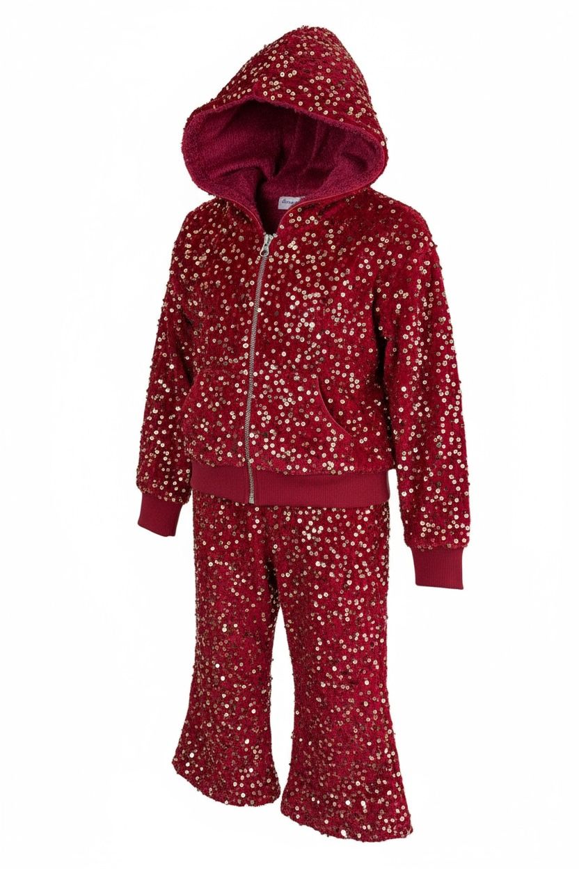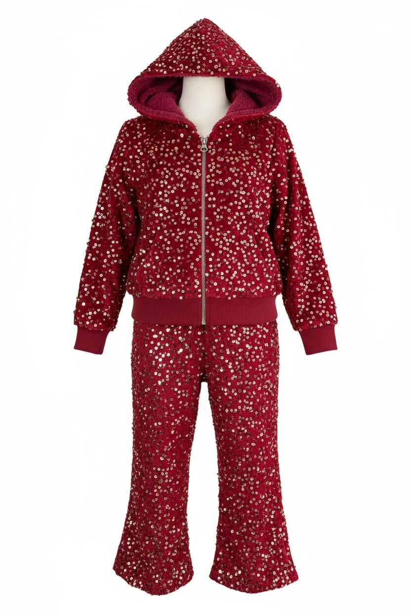 Αυτό το εκθαμβωτικό σετ περιλαμβάνει κόκκινη ζακέτα με φερμουάρ και παντελόνι από απαλό βελούδινο ύφασμα, διακοσμημένα με λαμπερές παγιέτες που αντανακλούν το φως με κάθε κίνηση. Εσωτερικά έχει γούνινη επένδυση ενώ το παντελόνι διαθέτει λάστιχο στη μέση και πλαϊνές τάπες.