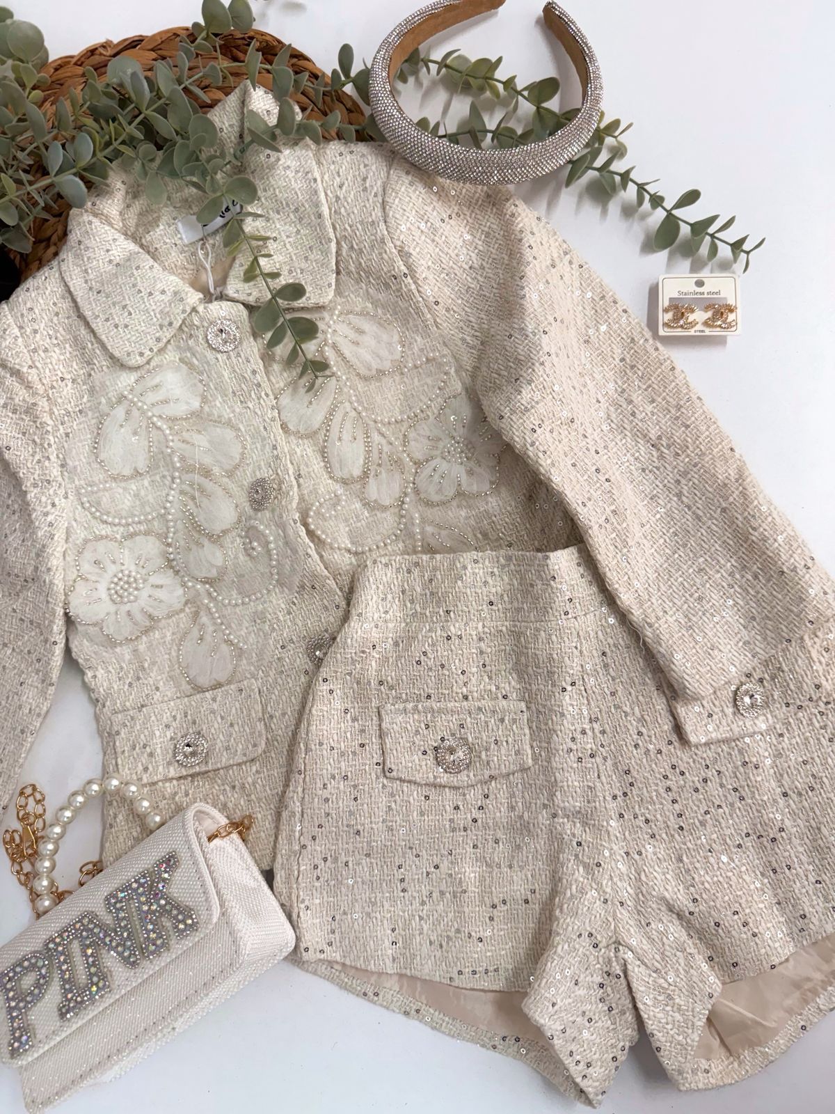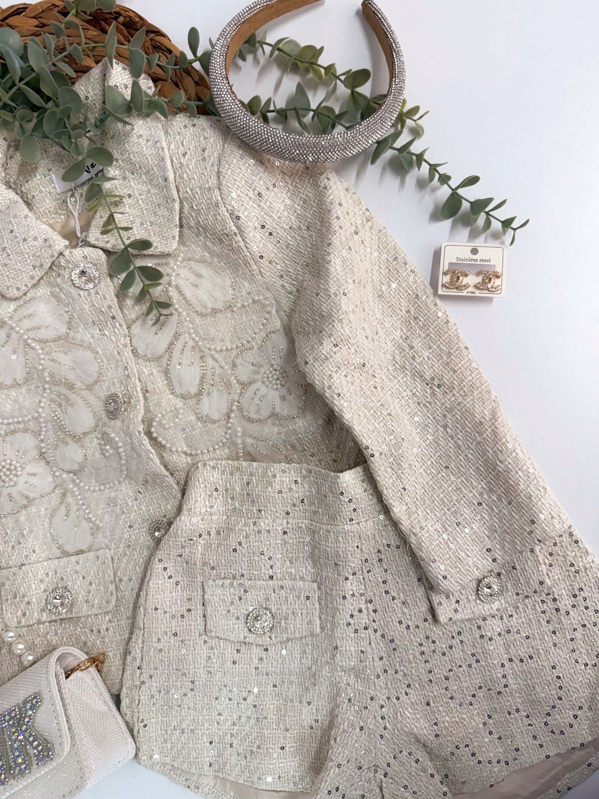 Το παιδικό σετ Sophia φέρνει την κομψότητα σε κάθε περίσταση! Αποτελείται από σακάκι με διακριτικά σχέδια και εντυπωσιακές λεπτομέρειες με παγιέτες, καθώς και σορτσάκι σε αντίστοιχο ύφος. Το ιδιαίτερο ύφασμα με τη γυαλάδα του χαρίζει πολυτελή αίσθηση, ενώ παραμένει άνετο για πολύωρη χρήση. Είναι η ιδανική επιλογή για γιορτές, βαπτίσεις, πάρτι αλλά και κάθε ξεχωριστή στιγμή.